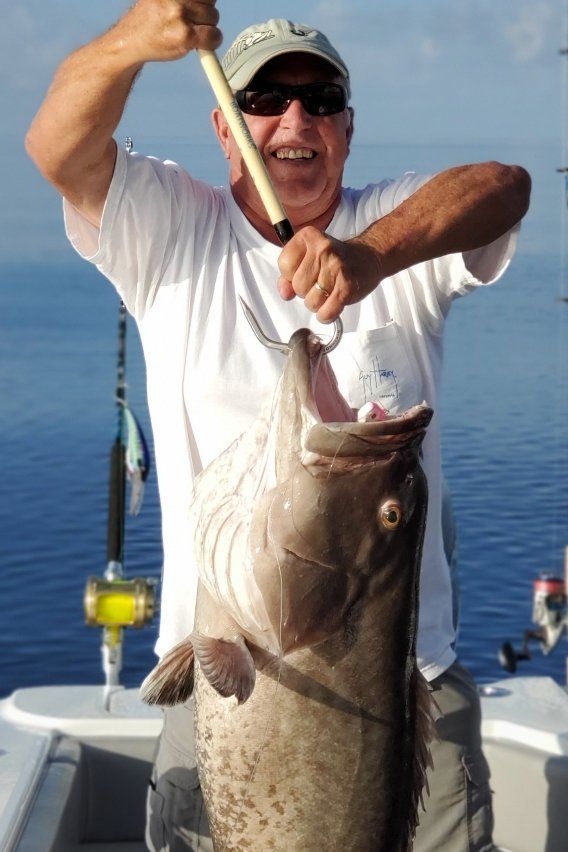 These grouper can grow as big as 50 pounds! we regularly catch them while bottom fishing for other fish in the same area as red grouper. We mostly target the big ones in deeper water from 140-200 feet of water. (50-70 miles form land) They are extremely hard fighting groupers! The open season for harvest is very short, but they are excellent to eat!